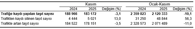 Trafiğe kaydı yapılan ve trafikten kaydı silinen motorlu kara taşıtları, Kasım 2025