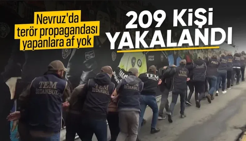 Açıklamada, Nevruz etkinlikleri kapsamında 2911 sayılı Toplantı ve Gösteri Yürüyüşleri Kanunu’na muhalefet ve örgüt propagandası suçlarından yürütülen çalışmalar kapsamında toplam gözaltı sayısının 209 olduğu açıklandı.