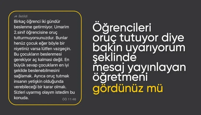 Mesajında veliye uyarıda bulunan öğretmenin "Birkaç öğrenci iki gündür beslenme getirmiyor. Umarım 2'nci sınıf öğrencisine oruç tutturmuyorsunuzdur.