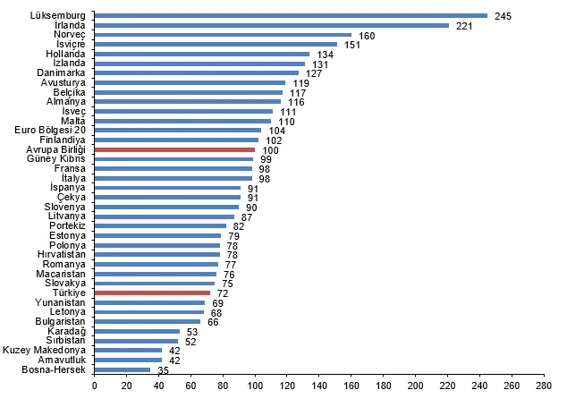Avrupa Birliği İstatistik Ofisi (Eurostat) tarafından açıklanan SGP'ye göre kişi başına gayrisafi yurt içi hasıla (GSYH) endeksi 2024 yılı sonuçlarına göre 27 Avrupa Birliği (AB) ülkesi ortalaması 100 iken, bu değer Türkiye için 72 oldu ve AB ortalamasının %28 altında kaldı.