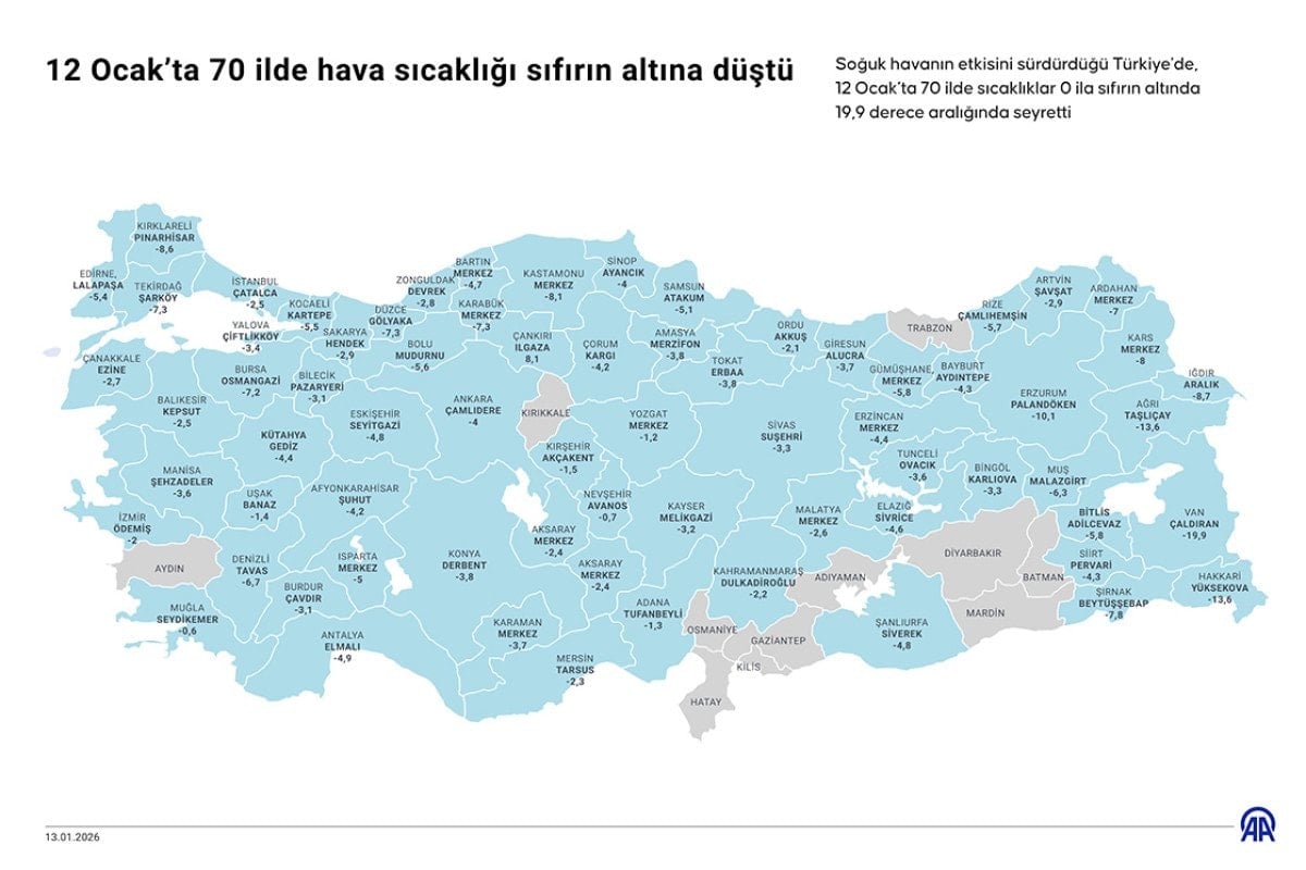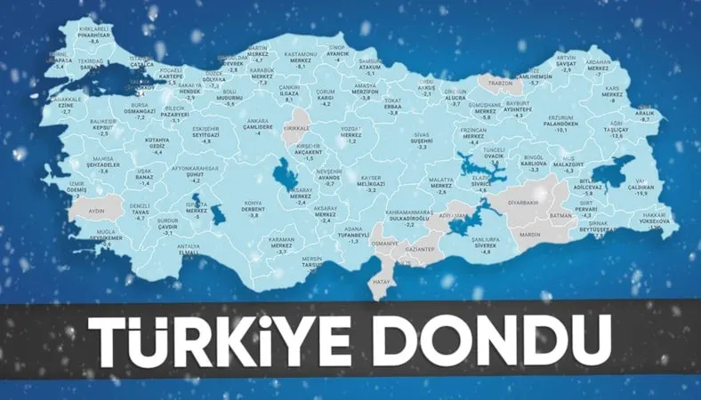 Dün 70 ilde sıcaklıklar, ilçelere göre eksi 0,6 ila eksi 19,9 derece aralığında seyretti.