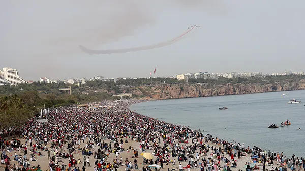 Türk Hava Kuvvetleri’ne bağlı akrobasi timi Türk Yıldızları, 23 Nisan Ulusal Egemenlik ve Çocuk Bayramı’nda Antalya semalarında gösteri uçuşu gerçekleştirdi. Konyaaltı Sahili’nde gerçekleştirilen gösteri uçuşunu izlemek isteyen on binlerce vatandaş sahil bandına akın etti. Konyaaltı Sahili hınca hınç insanla dolarken, iğne atsan yere düşmez denilen görüntüler yaşandı. Vatandaşların 23 Nisan Ulusal Egemenlik ve Çocuk Bayramı coşkusu, Türk Yıldızlarının muhteşem gösterisinde zirveye çıktı.