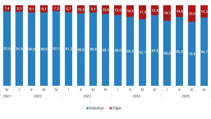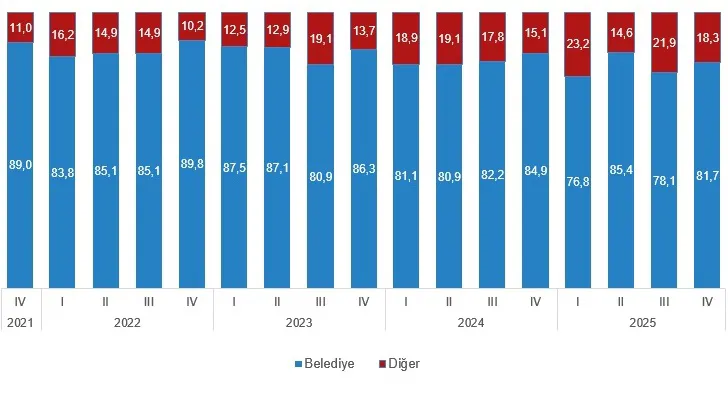 Yapı kullanma izin belgesi verilen yüzölçümde belediye ve diğer yetkili idarelerin payları (%), IV. Çeyrek 2025