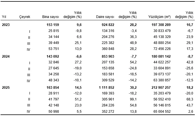 Bir önceki yılın aynı çeyreğine göre, 2025 yılı IV. çeyreğinde yapı kullanma izin belgesi verilen bina sayısı %0,1 ve yüzölçüm %1,5 azalırken daire sayısı %3,1 arttı.