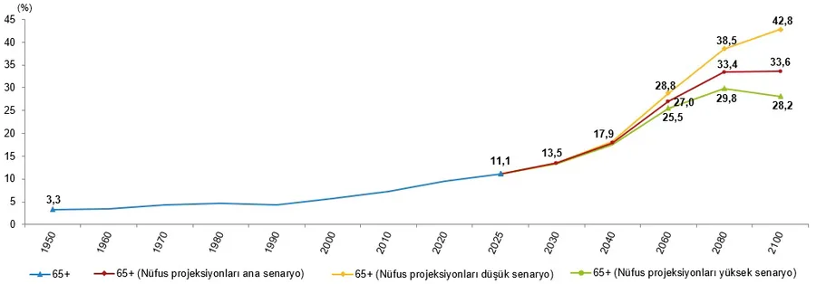 Nüfus projeksiyonlarının demografik göstergelerdeki mevcut yapının devam edeceğini varsayan ana senaryosuna göre yaşlı nüfus oranının 2030 yılında %13,5, 2040 yılında %17,9, 2060 yılında %27,0, 2080 yılında %33,4 ve 2100 yılında %33,6 olacağı öngörüldü.