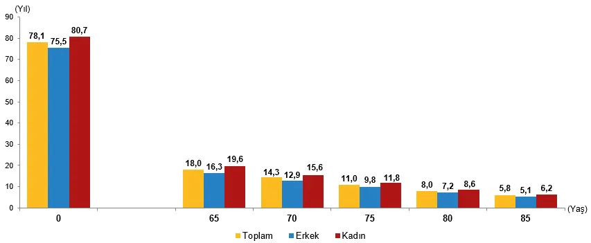 Türkiye'de 65 yaşına ulaşan bir kişinin beklenen yaşam süresi ortalama 18,0 yıl oldu. Erkekler için bu sürenin 16,3 yıl, kadınlar için 19,6 yıl olduğu gözlendi. Diğer bir ifade ile 65 yaşına ulaşan kadınların erkeklerden ortalama 3,3 yıl daha fazla yaşayacağı tahmin edildi. Beklenen yaşam süresi 75 yaşında 11,0 yıl iken 85 yaşında 5,8 yıl oldu.