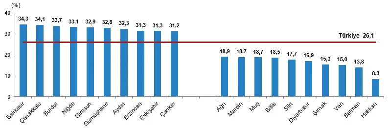 En az bir yaşlı fert bulunan haneler içinde tek kişilik yaşlı hanehalkı oranının en yüksek olduğu il, 2025 yılında %34,3 ile Balıkesir oldu. Bu ili %34,1 ile Çanakkale, %33,7 ile Burdur izledi. Bu oranın en düşük olduğu il ise %8,3 ile Hakkari oldu. Bu ili %13,8 ile Batman, %15,0 ile Van izledi.