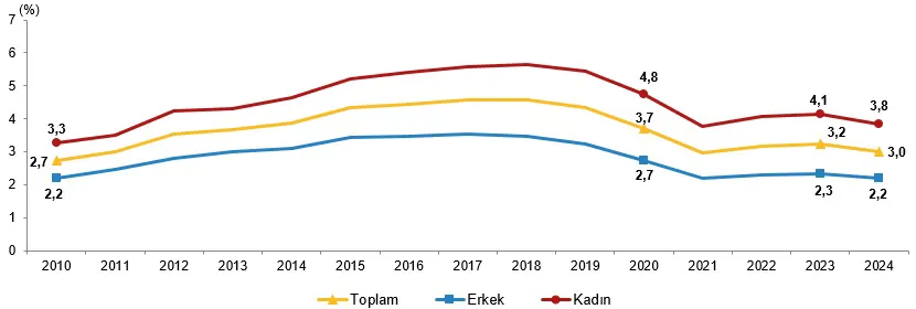 Yaş grubu ve cinsiyete göre işgücü durumu, 2024