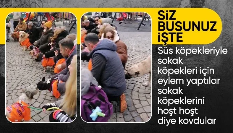 Sokak hayvanlarına ilişkin atılan adımları eleştiren birkaç kişi, bu durumu protesto etmek amacıyla yanlarına aldıkları 'süs köpekleriyle' bir araya geldi.